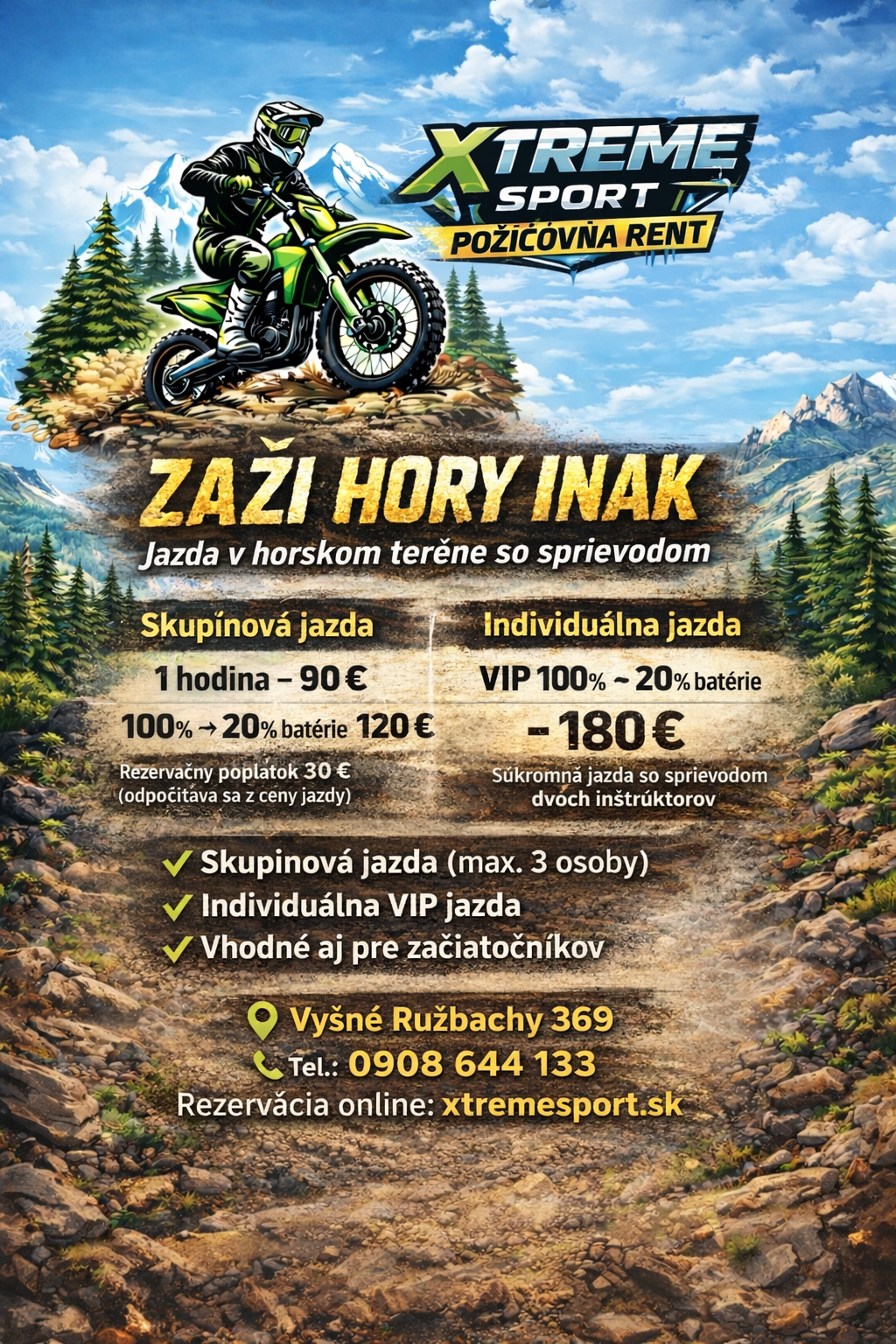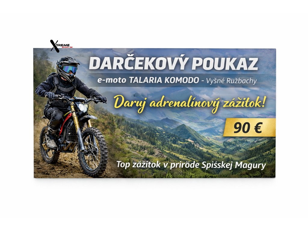 Daruj zážitok namiesto veci. Darčekový poukaz XTREMEsport vo Vyšných Ružbachoch platí na e-moto jazdy. Platnosť 12 mesiacov. Adrenalínová jazda na e-moto Talaria s doprovodom v prírode Spišskej Magury. Originálny darček pre milovníkov zážitkov.